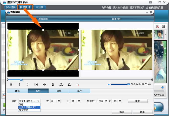 視頻編輯分為截取、剪切、效果調節(jié)、加水印等功能選項。即可以將視頻中的某段截取出來;去掉視頻的黑邊、不想要的水??;調節(jié)視頻的亮度、對比度、飽和度、音量等;為視頻添加文字水印、圖片水印等。具體的可以自己操作體驗下。
