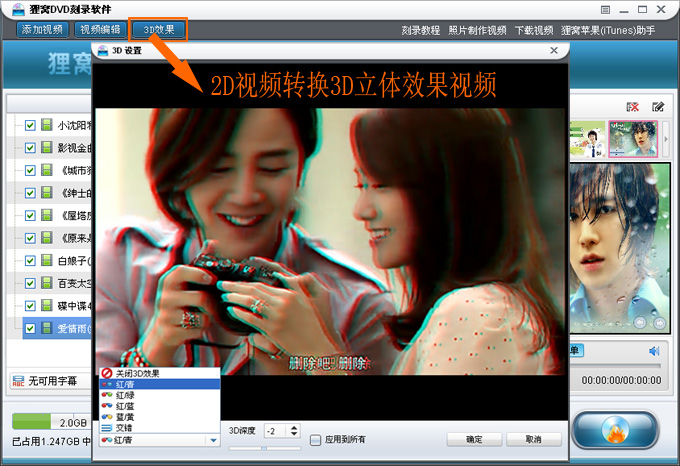 2D效果,即可將任意2D視頻轉換成3D立體視頻。3D效果分有紅/青、紅/綠、紅/藍、藍/黃、交錯、并排等的效果還有3D深度的設置,分正負值的3D深度,正值就是對視頻的深入,負值就是出鏡。