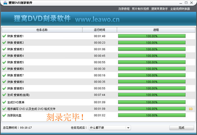 設置好相關參數(shù)后,放入空白刻錄盤,單擊“立即刻錄”按鈕,開始刻錄進程??啼浲戤吅?,刻錄機會自動彈出刻好的DVD光盤。證明整個刻錄操作完畢。呵呵,可以把刻好的光盤拿到DVD影碟機上播放看看了。