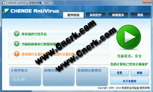 CHENOE Antivirus是一款完全免費(fèi)的殺毒軟件。集小巧、輕便、綠色的特點(diǎn)。我們采用了先進(jìn)的云端安全技術(shù),實時聯(lián)動的云端毒庫免除了不必要的更新,讓您在面對重大病毒時第一時間得到我們提供的解決方案。智能文件防護(hù)集成了領(lǐng)先的智能啟發(fā)式監(jiān)控,可快速、準(zhǔn)確防御未知病毒。周到的可移動介質(zhì)防護(hù),提供對U盤等移動設(shè)備的強(qiáng)大保護(hù),完全排除可移動設(shè)備的安全風(fēng)險。新增人性化的游戲模式,讓您在游戲激戰(zhàn)中免受打擾,盡情暢游。在網(wǎng)絡(luò)安全方面,我們還集成了惡意網(wǎng)站攔截,強(qiáng)大的數(shù)據(jù)庫使您上網(wǎng)沖浪時無懼惡意網(wǎng)站威脅。我們還引進(jìn)了智能識別加殼技術(shù),有效查殺各類流行殼。另外,為高級用戶量身定制的高級工具集還集成了文件粉碎機(jī),絕殺頑固程序。除此之外,貼心的MD5校驗與系統(tǒng)痕跡清理是您修復(fù)、優(yōu)化計算機(jī)的絕佳幫手。
