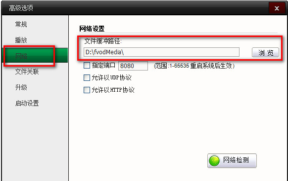 左側(cè)菜單選擇網(wǎng)絡(luò)、就可以看到文件緩沖路徑,點(diǎn)擊瀏覽即可找到已經(jīng)下載好的電影