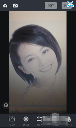 如圖,我以用poco美人相機(jī)隨機(jī)拍攝的一張照片為例,底部有多個(gè)美化和修飾效果選項(xiàng)可以供我們選擇。如【卡片】、【明暗】、【調(diào)色】、【銳化】、【虛化】。