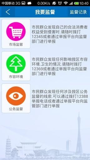 1、我的關(guān)注:獲取海珠區(qū)要情動(dòng)態(tài)、通知公告、政策文件等信息。2、我要監(jiān)督:提供監(jiān)督渠道,包含“市場(chǎng)監(jiān)管”,“市容環(huán)境”,“公務(wù)監(jiān)督”子模塊。