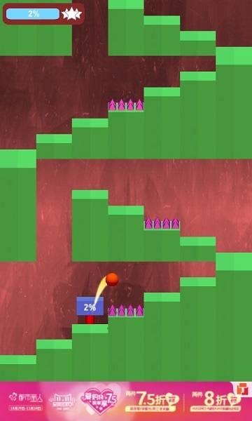 《快速跳躍Jumpy》里的小球會極快地自動跳躍,而一旦遇到地上的尖刺障礙,馬上就會粉身碎骨!因此玩家必須在它即將碰到前點擊屏幕來躲避它們,盡可能地讓小球到達終點。別看一開始就很困難,后面的關(guān)卡才真讓人痛不欲生吶!