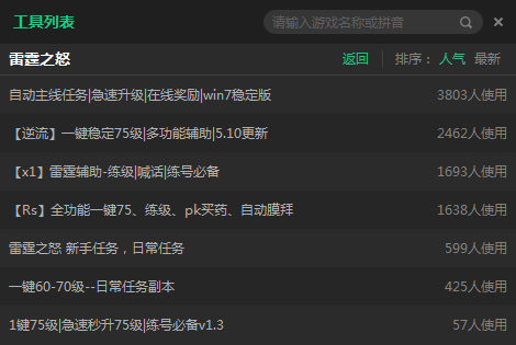 新浪雷霆之怒輔助是同名頁游《雷霆之怒》的輔助工具,這款雷霆之怒免費(fèi)輔助不僅能為玩家提供了自動(dòng)主線、副本、日常等特色功能,還可以自動(dòng)喊話、小號(hào)多開等,一鍵掛機(jī)坐等升級(jí),讓玩家徹底解放雙手,直接體驗(yàn)游戲不一樣的樂趣所在。