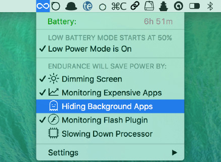 Endurance的工作機(jī)制和iOS9的低電量工作模式差不多,當(dāng)Mac電量低于一定百分比時(shí)(90%–15%)會(huì)自動(dòng)觸發(fā)(LowPowerMode),模式開啟后會(huì)對(duì)屏幕亮度進(jìn)行調(diào)暗,監(jiān)控消耗系統(tǒng)資源太多的軟件程序(比如Chrome)、Flash插件,隱藏后臺(tái)應(yīng)用程序,并對(duì)處理器進(jìn)行降速,據(jù)官方稱,這款軟件能在低電量模式下為設(shè)備延長(zhǎng)約20%的額外電量使用時(shí)間。