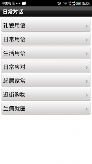 2、包含日常對(duì)話、生活雜事、常識(shí)應(yīng)用、交際應(yīng)酬等大類,每個(gè)大類下有各個(gè)場(chǎng)景的小類,清晰的分類更加便于掌握和使用不同場(chǎng)景下的詞匯和語(yǔ)句。