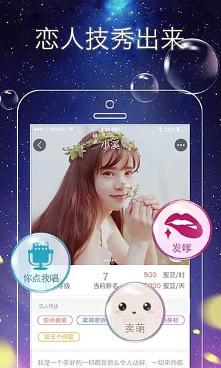 甜蜜戀人,創(chuàng)新中國大賽獲獎應(yīng)用。全新的男神&女神聊天陪護平臺,打發(fā)孤單,告別無聊,找個喜歡的人來陪伴!