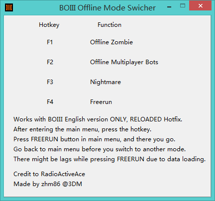 黑色行動3離線模式切換器是同名游戲《黑色行動3》的一款修改器軟件,這款黑色行動3修改器支持單機僵尸、離線多人BOTS等共四種模式,玩家可以通過這款軟件快速切換模式,享受超爽的游戲體驗。