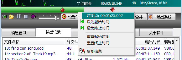 菜單“輸出時(shí)間段”---用于設(shè)置選定文件輸出時(shí)間段,避免了先剪切到一個(gè) 磁盤(pán)文件再將該文件加入合并的過(guò)程。