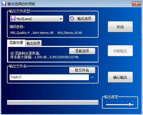 設(shè)置好輸出時(shí)間段后,點(diǎn)擊按鈕“輸出時(shí)段”,系統(tǒng)顯示如圖3-4所示的選項(xiàng)窗口,你可以設(shè)置你需要的輸出文件類(lèi)型、混音處理選項(xiàng)、輸出目錄以及輸出文件名