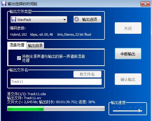 輸出選項(xiàng)設(shè)置好后,點(diǎn)擊按鈕“確認(rèn)輸出”,系統(tǒng)開(kāi)始輸出文件,如圖所示,在輸出文件的過(guò)程中,你可以點(diǎn)擊按鈕“中斷輸出”隨時(shí)終止文件的輸出,也可以根據(jù)您的CPU占用情況調(diào)整輸出速度。