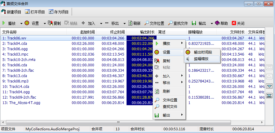 通過(guò)合并項(xiàng)目文件對(duì)要合并的文件進(jìn)行管理,可加入、移除、復(fù)制、粘貼要合并的文件以及調(diào)整合并項(xiàng)的合并順序,可以指定合并項(xiàng)的輸出時(shí)間段。