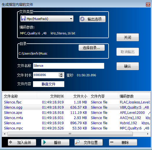 圖中,可以先創(chuàng)建您所需要內(nèi)容的文件(目前為靜音文件),然后從生成的文件列表中選擇需要加入合并的文件,可以生成任意時(shí)長(zhǎng)指定內(nèi)容的音頻文件。