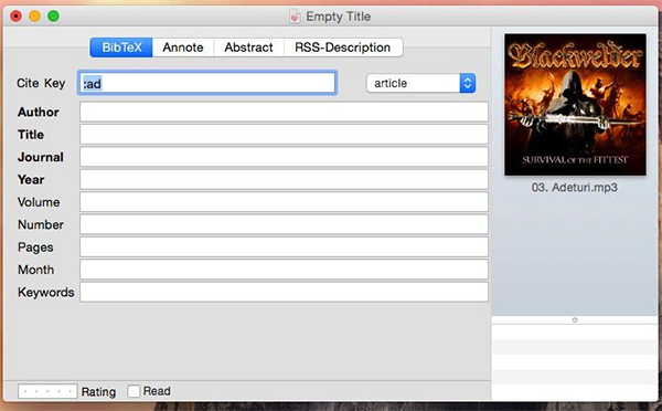 BibDesk是一款非常專業(yè)的參考文獻(xiàn)管理軟件,這款軟件可幫你管理和使用Bib TeX .bib格式的文獻(xiàn)數(shù)據(jù)庫(kù),還允許用戶將.bib文件拖拽或剪切復(fù)制到文獻(xiàn)數(shù)據(jù)庫(kù)中,并且,通過(guò)這款軟件,我們只要按下幾個(gè)鍵,就能快速搜索數(shù)據(jù)庫(kù)的文件,享受極其便利的操作體驗(yàn)。