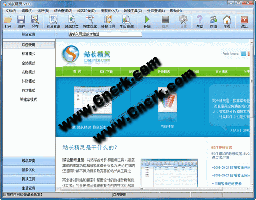 站長(zhǎng)精靈是一款功能強(qiáng)大的網(wǎng)站(頁(yè))、關(guān)鍵詞分析優(yōu)化工具,它具有高度集成、智能靈活、使用簡(jiǎn)單、綠色設(shè)計(jì)的特點(diǎn),內(nèi)置六大綜合批量查詢模式,數(shù)十項(xiàng)極具特色的單項(xiàng)查詢分析功能,囊括目前常用的查詢項(xiàng)目,并且擁有多項(xiàng)獨(dú)具特色的查詢分析功能,采用多線程核心代碼,它能在極短的時(shí)間內(nèi)返回大量的查詢數(shù)據(jù),讓使用者輕而易舉地得出正確的判斷,無論是網(wǎng)站建設(shè)推廣、關(guān)鍵詞優(yōu)化、域名買賣等方面都可以給出綜合權(quán)威的數(shù)據(jù)以供分析,極大地提高網(wǎng)站管理人員的工作效率。