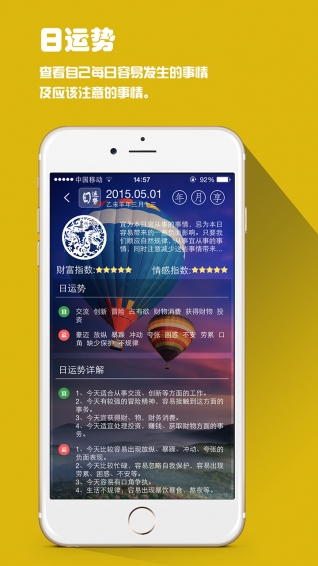 4.特色功能:星座運勢、資訊卡片、周公解夢、觀音靈簽、財喜羅盤、安全期管理、人體節(jié)律。