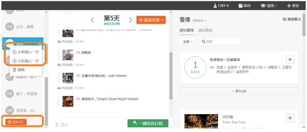 (2)在行程編輯界面的第二列(中間列),左側(cè)有一個(gè)小小的管理按鈕,鼠標(biāo)移上去會(huì)出現(xiàn)菜單,菜單中有“之前插入一天”和“之后插入一天”的操作。