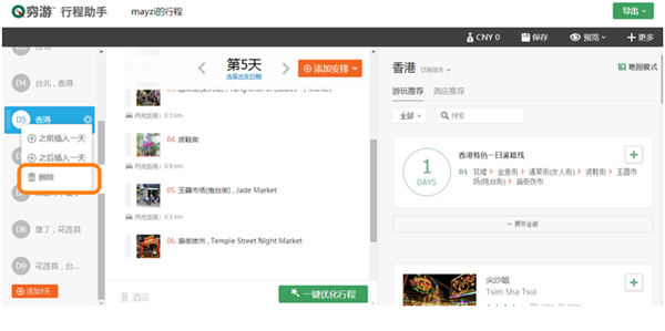 (1)在行程編輯界面的最左側(cè)(第一列),鼠標(biāo)移到某一天會(huì)出現(xiàn)小的垃圾桶標(biāo)志,點(diǎn)擊即可刪除這一天。