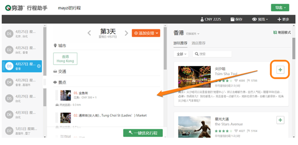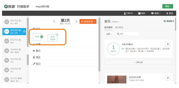 (方法1) 在編輯界面最右側(cè),我們會(huì)推薦每個(gè)城市的熱門景點(diǎn)、餐飲等,點(diǎn)擊“添加到行程”按鈕即可一鍵添加。