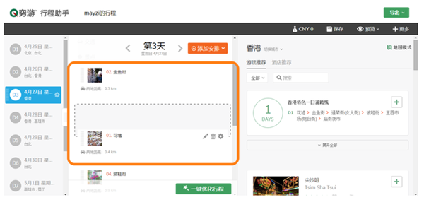 可以在每一天中,鼠標(biāo)點(diǎn)擊選中某個(gè)景點(diǎn)并進(jìn)行拖動(dòng),從而調(diào)整順序。