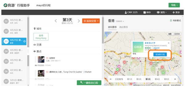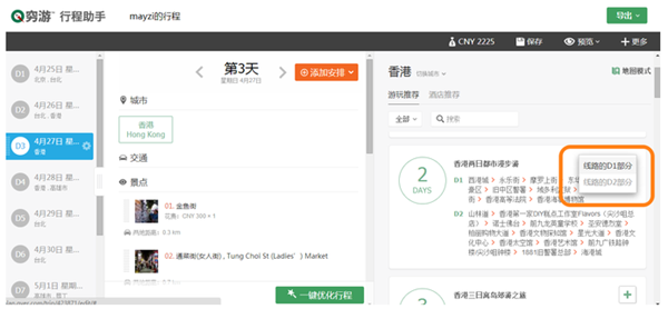 在編輯界面最右側(cè),我們會(huì)推薦每個(gè)城市的經(jīng)典線路,點(diǎn)擊“添加到行程”按鈕即可一鍵添加。