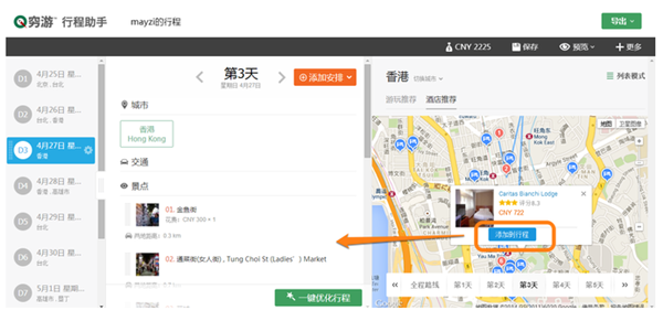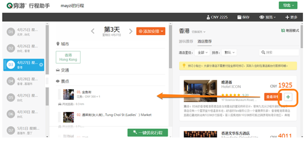 (方法1) 在編輯界面最右側(cè),我們會(huì)推薦每個(gè)城市的熱門酒店,點(diǎn)擊“添加到行程”按鈕即可一鍵添加。