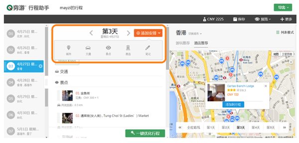在編輯界面第二列的右上角,有“當(dāng)日地圖”按鈕,點(diǎn)擊即可看到每日的行程地圖。