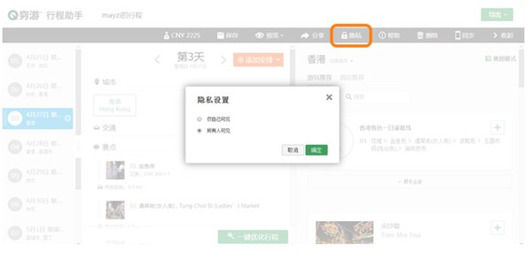 如果您擔(dān)心自己的行程中包括隱私信息,不希望被其他人看到,則可以在編輯界面的右上角“設(shè)置”中,選擇“隱私設(shè)置”,將行程設(shè)置為私密行程。私密行程將不會(huì)被其他用戶搜索及瀏覽到,能夠保證隱私不被泄露。