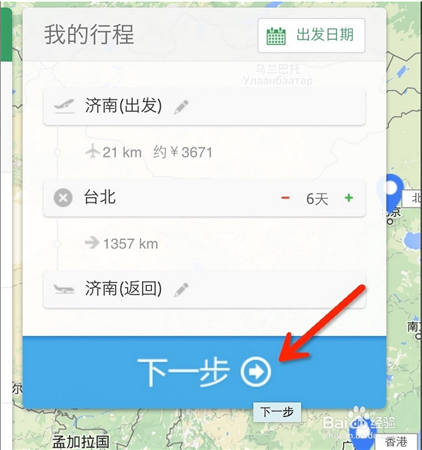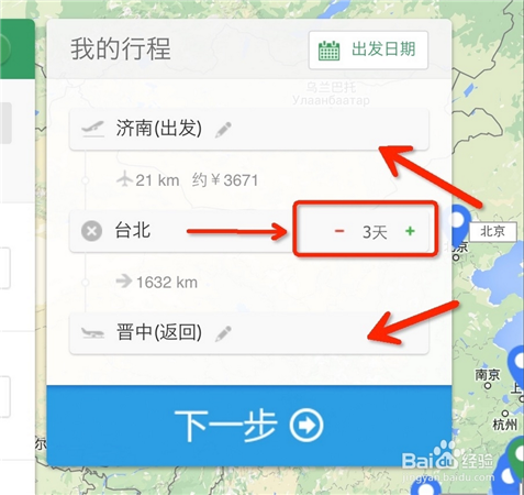 在彈出的“我的行程”中,先選擇出發(fā)城市和回來(lái)的城市,在中間的目的地選擇天數(shù)。