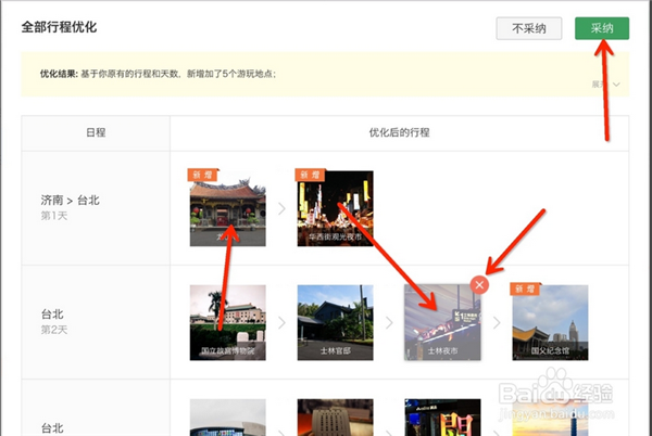 對(duì)每天的行程安排你可以用鼠標(biāo)拖動(dòng)、調(diào)整,最后點(diǎn)擊右上角的“采納”,確定。