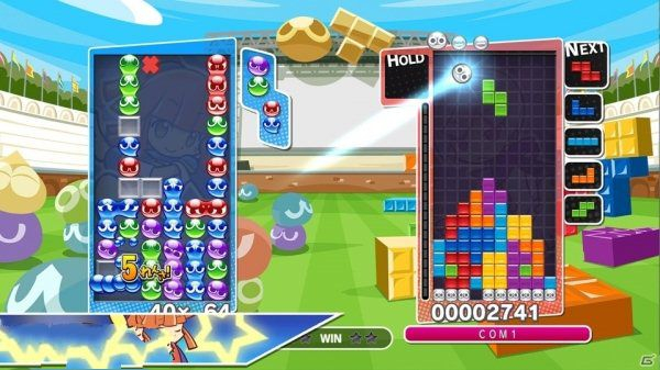 -《噗喲噗喲》與《俄羅斯方塊》一起游玩,《噗喲噗喲》的連鎖與《俄羅斯方塊》的清除連續(xù)進(jìn)行的話,可發(fā)生MIX連鎖給對(duì)手強(qiáng)力妨礙攻擊。