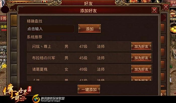 在主界面下方的社交-好友界面,可以添加好友。點擊下方的“添加好友”按鈕,可以看到當前在線的玩家,可以選擇某個玩家后點擊右側的“加為好友”,也可以點擊下方的“一鍵添加”。如果已知好友的名字,也可以在上方輸入好友的角色名進行精確查找。平時組隊或者做任務的時候,遇到志同道合的玩家,也可以點擊其頭像,在下拉菜單中選擇“加為好友”。