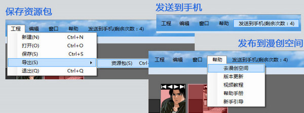 五、選擇“工程—導(dǎo)出”保存作品資源包到本地,或者點(diǎn)擊“發(fā)送到手機(jī)”生成二維碼,也可以點(diǎn)擊“幫助—去漫創(chuàng)空間”發(fā)布作品到漫創(chuàng)空間創(chuàng)業(yè)平臺(tái)。
