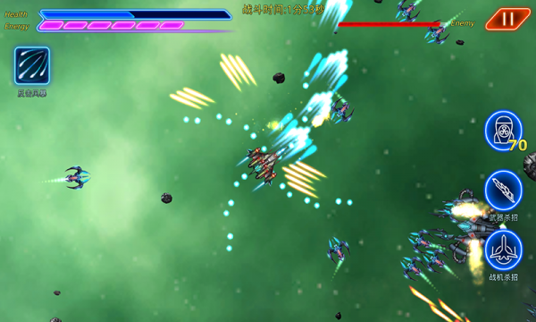 《激戰(zhàn)銀河》作為一款輕度休閑的飛行射擊類手機(jī)游戲,操縱簡(jiǎn)單,玩家只需要用搖桿操控飛機(jī),躲避敵人攻擊。而飛船的主武器,副武器是自動(dòng)進(jìn)行瞄準(zhǔn)射擊。 玩家只需要選擇最佳角度對(duì)敵人飛船進(jìn)行攻擊就可以。10種飛機(jī)機(jī)身,10種主武器,10種副武器,20種特殊武器芯片,根據(jù)玩家的感覺(jué)進(jìn)行自由搭配,表現(xiàn)出不同的防守,攻擊作戰(zhàn)能力。 飛船機(jī)身,主武器都有各自的技能大招。玩家擊毀敵人飛船可以隨機(jī)獲得水晶能量,這些水晶能量在戰(zhàn)斗中可以開(kāi)啟飛船和主武器的各種大招技能。這些技能有的是防守型的,例如防護(hù)罩,有的是攻擊型的,給敵人飛船以致命的打擊。水晶能量在戰(zhàn)斗之外,可以升級(jí)武器裝備,操縱好飛船,盡可能多的收集水晶能量升級(jí)武器。伙伴們,讓我們駕駛著強(qiáng)大的戰(zhàn)斗飛船,驅(qū)逐來(lái)犯的外星人吧。
