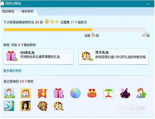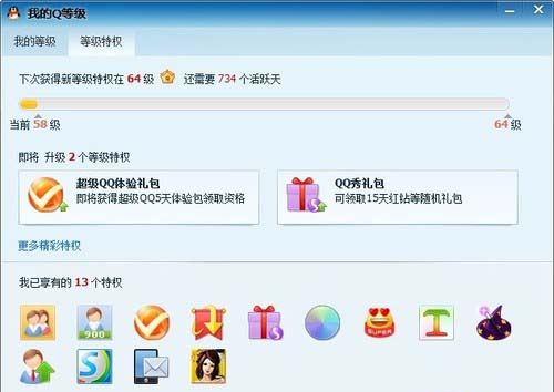 3、超級(jí)QQ體驗(yàn)特權(quán)。QQ等級(jí)從16級(jí)起每增加8級(jí)即可獲得一個(gè)5天的超級(jí)QQ體驗(yàn)禮包。