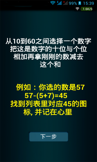 玩家在游戲中任意選擇一個(gè)兩位數(shù)(或者說,從10~60之間任意選擇一個(gè)數(shù)),把這個(gè)數(shù)的十位與個(gè)位相加,再把任意選的數(shù)減去這個(gè)和。例如:你選的數(shù)是23,然后2+3=5,然后23-5=18,然后在圖表中找出與最后得出的數(shù)所相應(yīng)的圖形,并把這個(gè)圖形牢記心中,然后點(diǎn)擊水晶球。你會發(fā)現(xiàn),水晶球所顯示出來的圖形就是你剛剛心里記下的那個(gè)圖形。