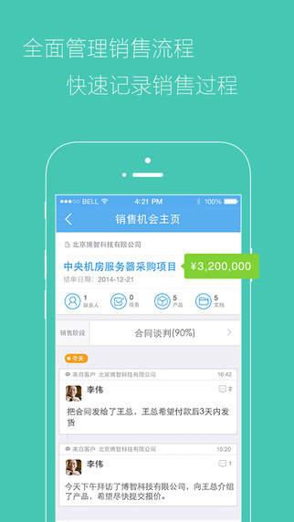 1、客戶資源流失:客戶頁面記錄完整客戶信息、所有溝通細(xì)節(jié),同步云端,恒久保留。2、管理不透明: 儀表盤,讓銷售“過程、結(jié)果、行為”清晰可見,管理層能隨時(shí)隨地,掌握項(xiàng)目實(shí)時(shí)進(jìn)展,精準(zhǔn)預(yù)測業(yè)績,大幅提升贏率。