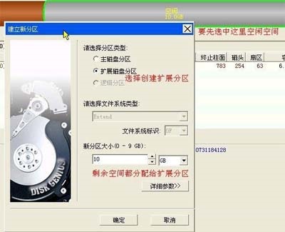 選擇創(chuàng)建擴(kuò)展分區(qū),并把剩余的空間都分配給擴(kuò)展分區(qū),并點(diǎn)擊確定。分配好擴(kuò)展分區(qū)后,如下圖: