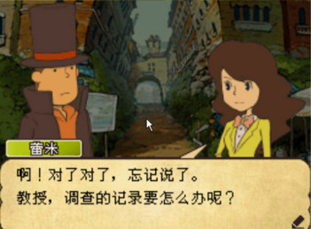 作品續(xù)作,因此游戲中的操作都可以用觸控筆來完成。上屏顯示的是地圖,并且在上屏下方會有下一步行動的指示,這樣一來,在流程的推進方面就不會有太大的問題。上屏左上方顯示的是目前解開的謎題數(shù)量,右上方顯示的是目前所在的地點名,方便隨時掌握當(dāng)前位置。當(dāng)要在各個場景移動時,只要點擊下屏右下角的鞋子圖標(biāo),下屏就會出現(xiàn)用來移動的箭頭,點擊箭頭就可以前往箭頭指示的地方。下屏右下角的圖標(biāo)代表雷頓教授的皮箱,可以進行儲存和隨時查看入手的謎題。