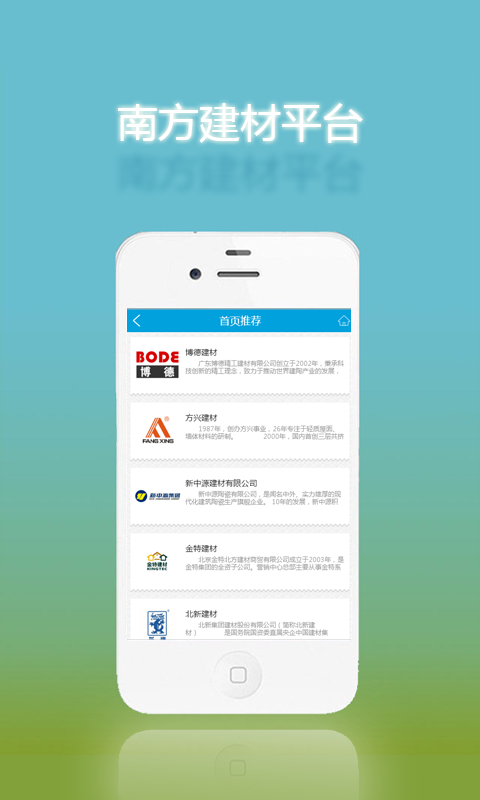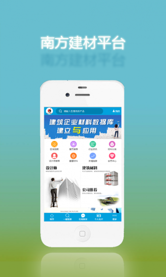 南方建材APP手機門戶平臺是由掌商工程技術(shù)研發(fā)的一站式整合服務(wù)平臺,平臺里面包含了首頁推薦,區(qū)域招商,材料分類,行業(yè)資訊,設(shè)計師推薦,基建材料等多方面的內(nèi)容,讓你更方便快捷的找到自己的需求歡迎各位下載使用。