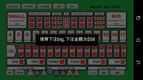 4.大小推薦器:此大小推薦器是作者根據(jù)傳統(tǒng)連續(xù)加倍下注(連續(xù)下大or連續(xù)下小)改編而成.此大小推薦器在紀錄搖骰10次之后,開始判斷是否推薦玩家下注大還是小,并且顯示推薦下注的數(shù)字.根據(jù)作者用大量點數(shù)做電腦分析,可以讓玩家滿足在長時間玩骰寶的情況下,也可以享受歡樂骰寶的滋味.有興趣的玩家可以嘗試看看!