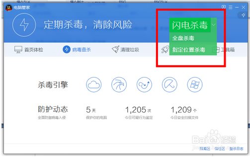 QQ安全管家在使用過程中,如果要?dú)⒍镜脑?,你可能會有疑問,怎么只有閃電殺毒了呢?其他全盤殺毒和指定位置查殺模式隱藏在了哪里?不要著急,點(diǎn)擊殺毒模式旁邊的向下的箭頭標(biāo)志,就可以看到并選擇殺毒啦。