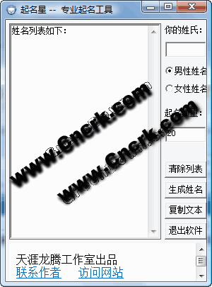 起名星--專業(yè)起名工具 V1.0 簡體中文綠色免費版 小巧而專業(yè)的起名工具,內置了民俗專家搜集整理的起名專用字,所起名字比較接近日常使用名字,具有較高的參考價值??梢葬槍δ信謩e起名,一次可以起幾十個甚至幾百個姓名。如果你正在為寶寶起名而煩惱,你不妨試試這個免費的小工具
