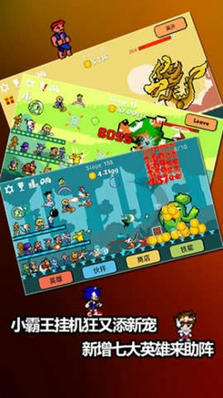 小霸王掛機狂是一款具有像素風格的放置類手機游戲,這款游戲畫面復古懷舊,玩法新穎獨特有趣,同時還有30名經(jīng)典紅白機游戲主角助你大戰(zhàn)BOSS,以及各種經(jīng)典游戲場景,讓玩家能在游戲中重溫童年記憶,享受超贊的游戲趣味。