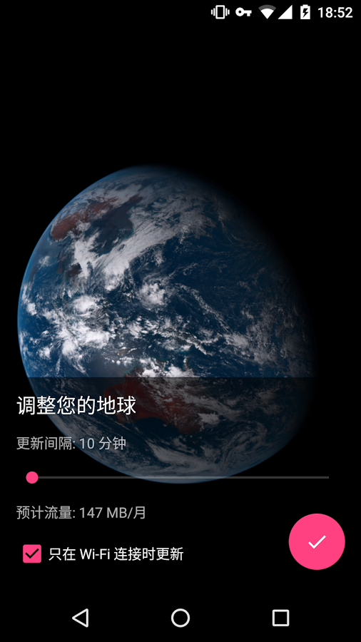 可設(shè)定最少10分鐘自動更新一次畫面,所以你的手機(jī)桌布就會是10分鐘前的地球。