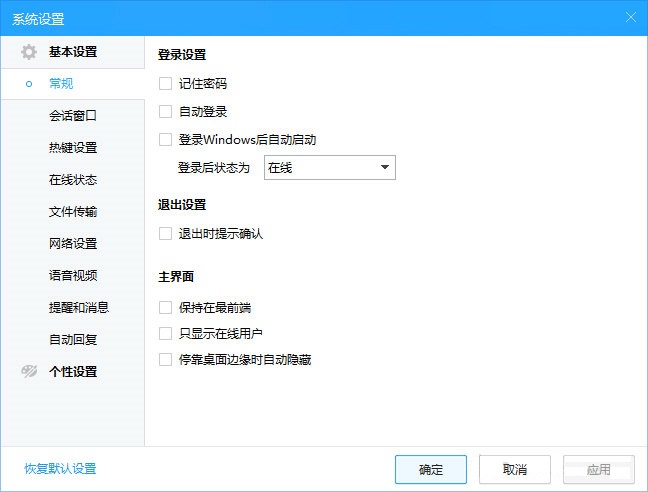 通過主菜單進(jìn)入到系統(tǒng)設(shè)置頁面,您可以根據(jù)自己的使用習(xí)慣對(duì)桌面客戶端進(jìn)行各項(xiàng)設(shè)置。