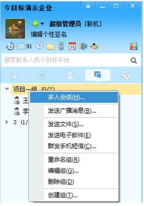 如果您是在部門或者自定義組中發(fā)起討論,還可以直接用鼠標(biāo)右鍵點(diǎn)擊部門或自定組名稱,從菜單中選擇多人會(huì)話,即可建立起屬于該部門或自定義組的多人會(huì)話。