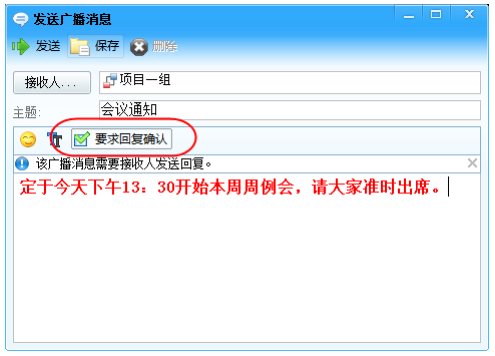 當(dāng)一些重要通知需要接收人必須查看或回復(fù)時(shí),可以選擇發(fā)送需要確認(rèn)的廣播消息。也就是在發(fā)送廣播消息的發(fā)送框中選中“√”,這樣發(fā)送出去的消息會(huì)要求對(duì)方必須回復(fù),否則會(huì)一直提醒對(duì)方有未讀消息。