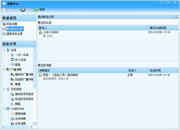 在今目標(biāo)平臺(tái)上發(fā)生的聊天記錄、廣播消息、短信發(fā)送記錄以及系統(tǒng)提醒消息等將會(huì)永久保存在今目標(biāo)平臺(tái)上,用戶自己是無法進(jìn)行刪除的,這樣可以充分保證與企業(yè)平臺(tái)相關(guān)的信息在任何時(shí)間地點(diǎn)都可以進(jìn)行查詢及利用。